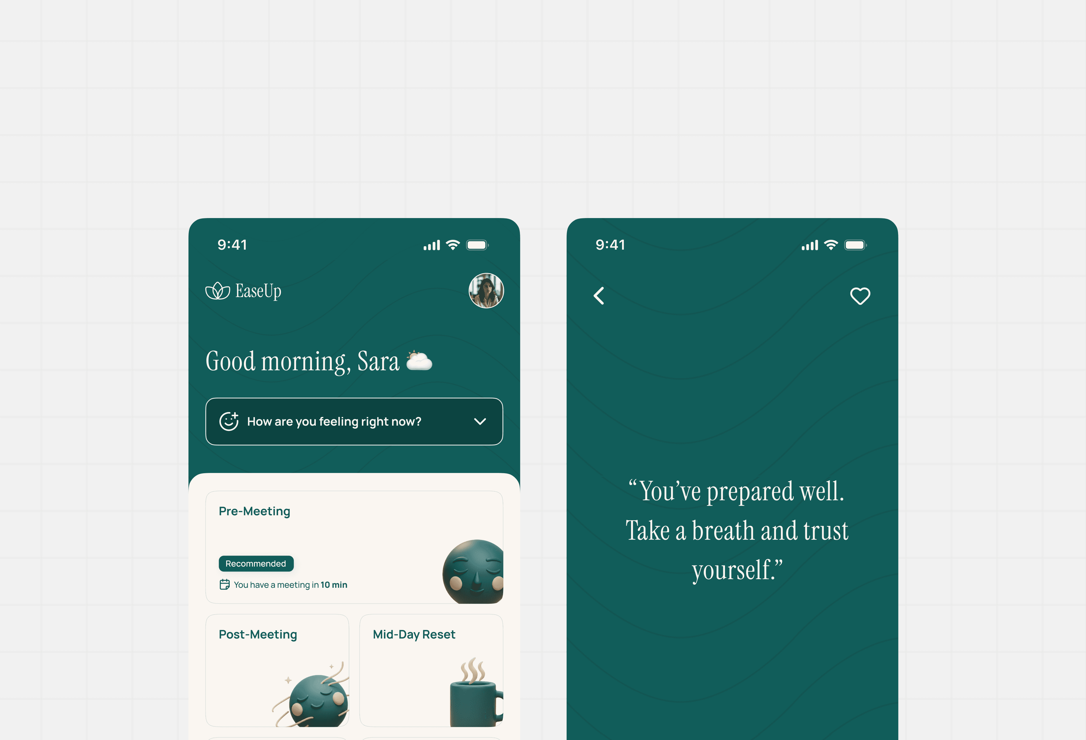 EaseUp offers context-aware, bite-sized calm routines that fit naturally into the workday — like Before Meeting Calm, Midday Breaks, and Focus Boosts. The app adapts to the user’s mood, schedule, and energy level, helping them build consistent mindfulness habits without disrupting productivity.